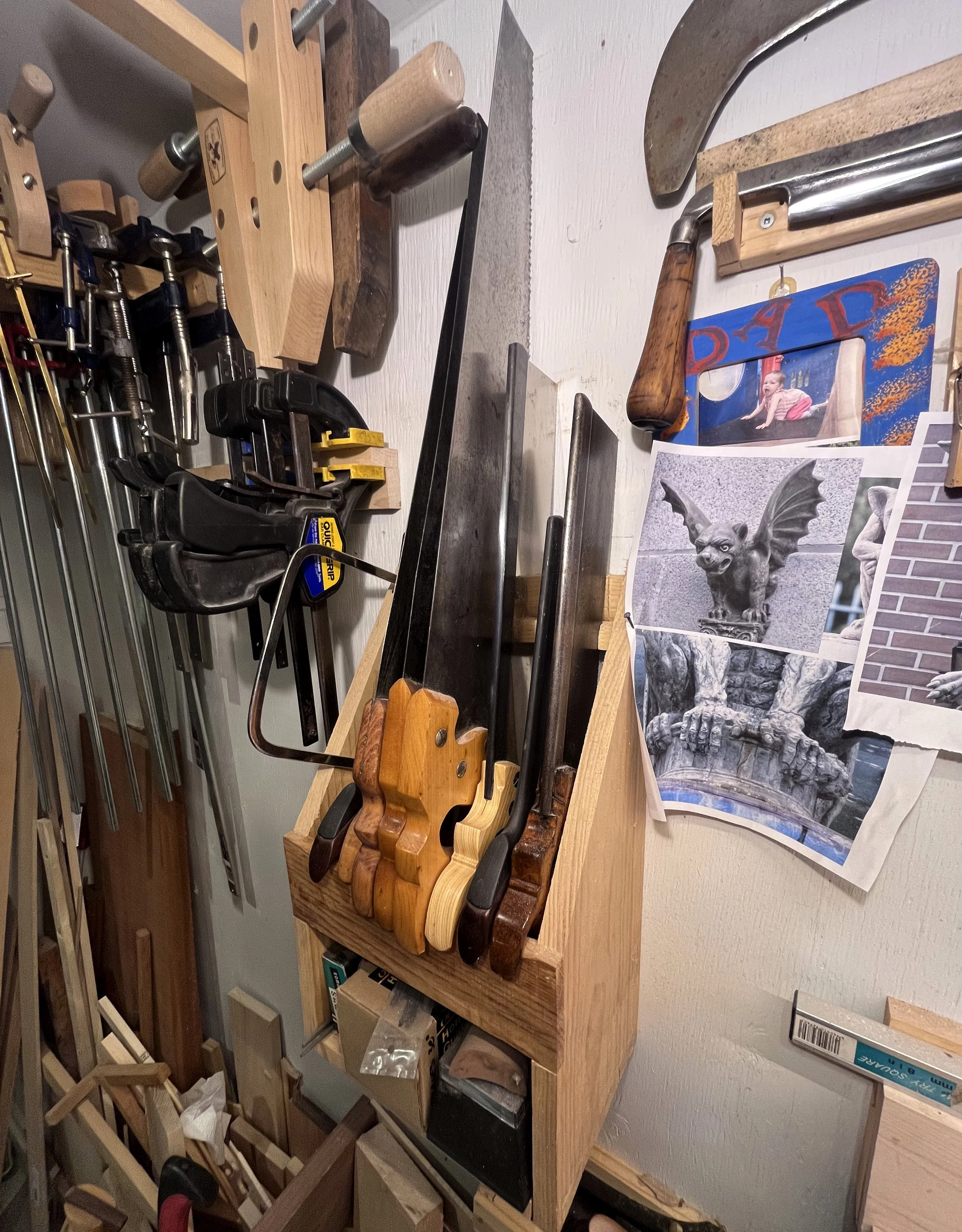With the bench I could get started on making all the rest of my storage. Given how little space I had I knew I needed to put as much as I could up on the walls. I made custom brackets and holders for all my saws, planes, hand drills, rulers, clamps and hammers. As I got deeper into the hobby and added tools, I reconfigured my storage again and again. Eventually I filled every square inch of that wall with tools, each with their own home.