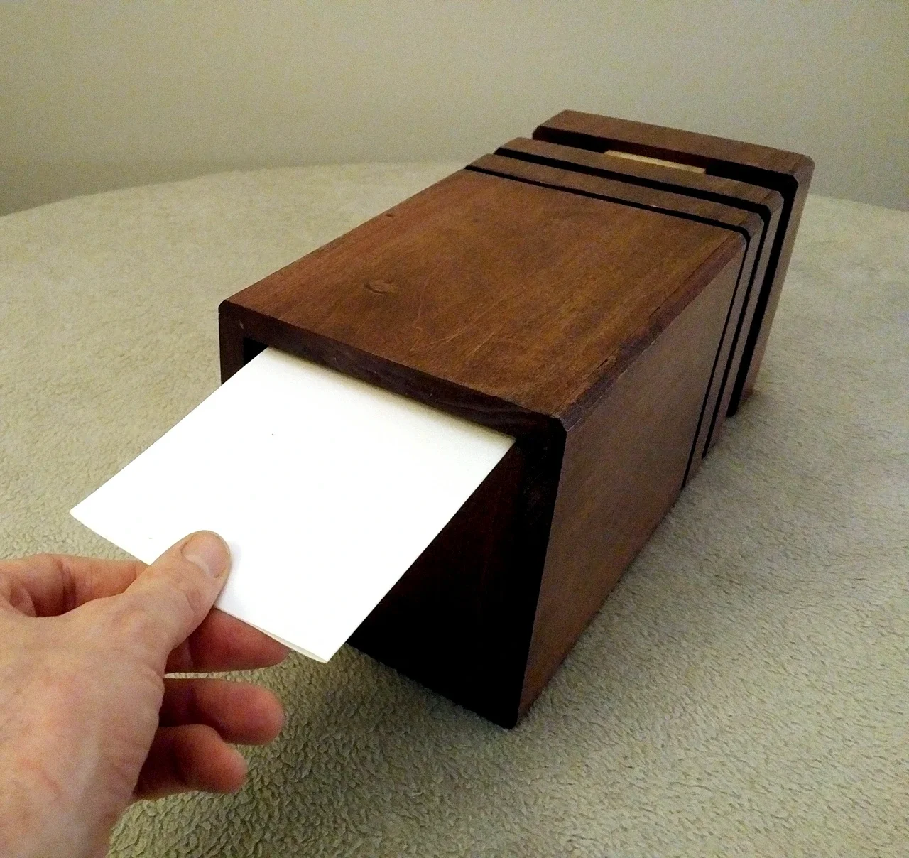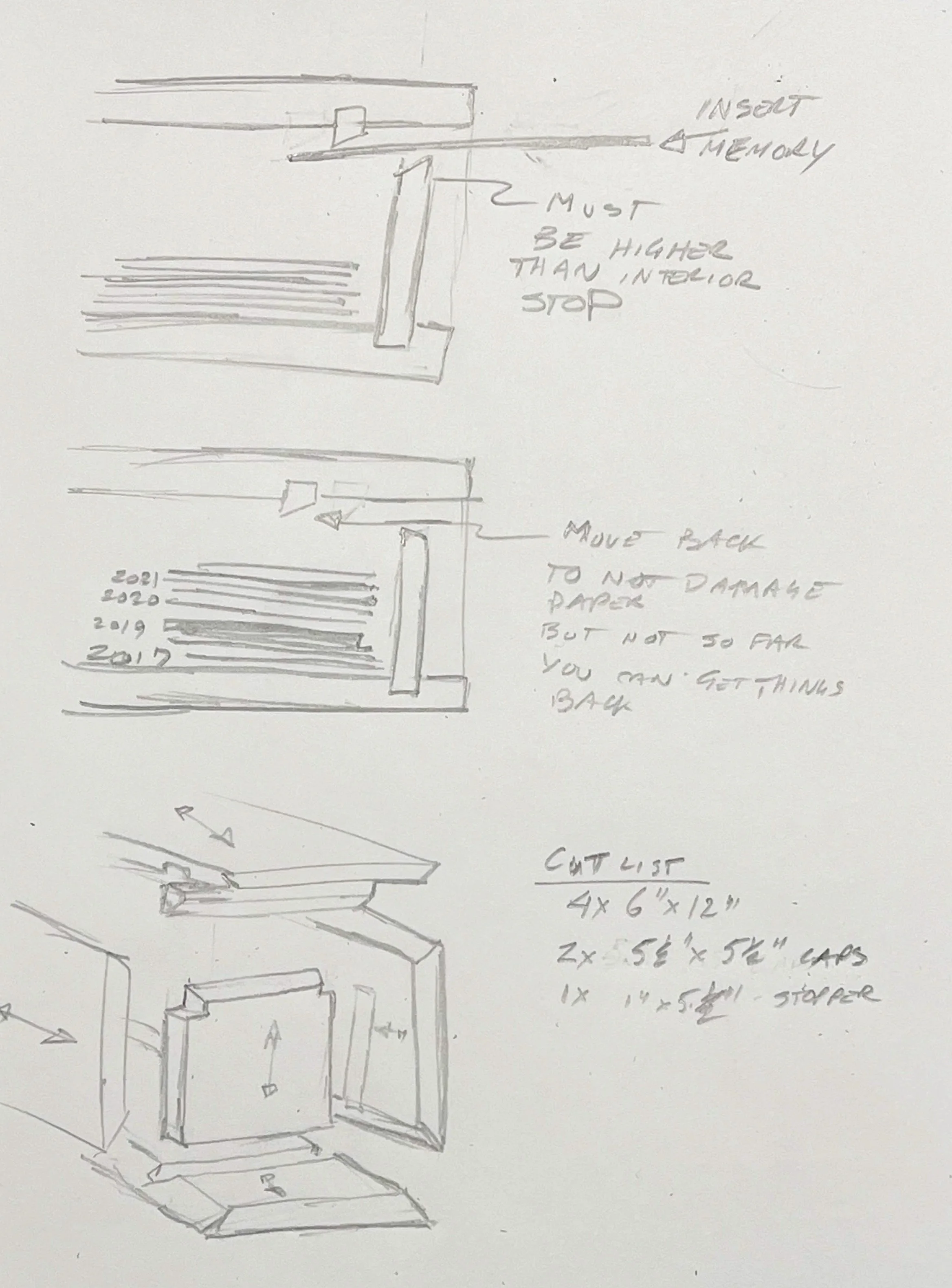 Unlike a traditional time capsule that you bury in the ground or under a building to dig up decades in the future, this is one that you add to year over year. I have designed a one-way mail slot where you can put in memories that, year over year, will build up and one day long in the future you will need to cut open destroying my delicate joinery.