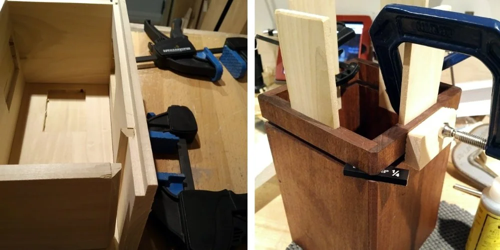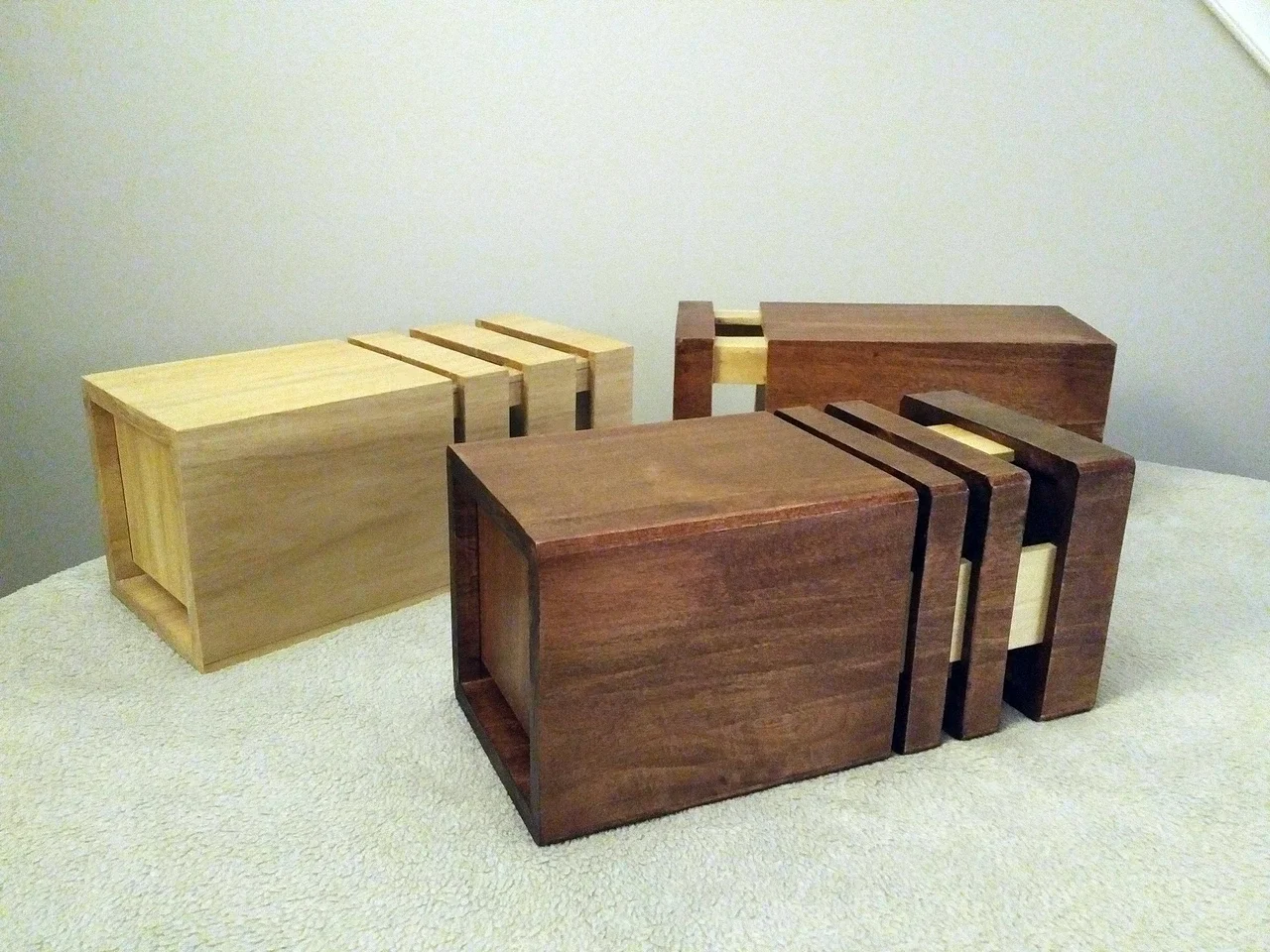The boxes are always finely made, always made of wood, sometimes some veneer, and assembled with rabbets, mitres, dadoes, half lap joints or whatever draws my fancy. I like to make them with contrasting woods to show off the shape as well as openings and gaps so you can see the memories stack up and become an archive of your family.