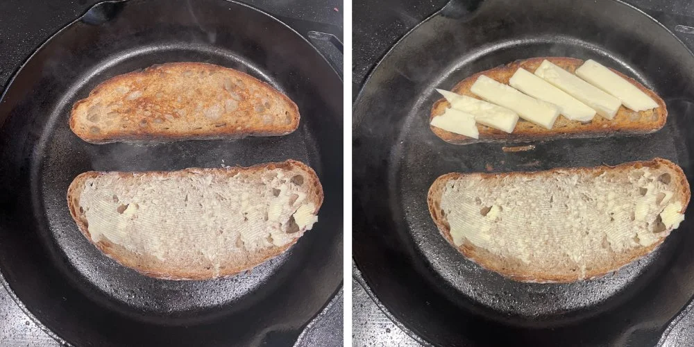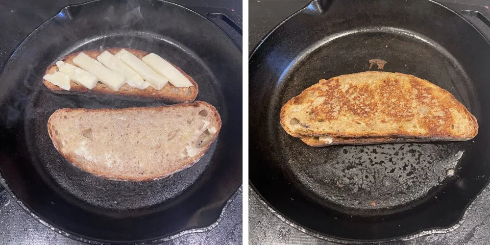 Put a 12-inch cast iron pan on the element and turn it up to medium heat, 4 or 5 of 10. You don’t want it too high because you want the heat to slowly warm the bread so it melts the butter before it burns the bread. It seems backwards, but a cooler element gives gooier cheese.