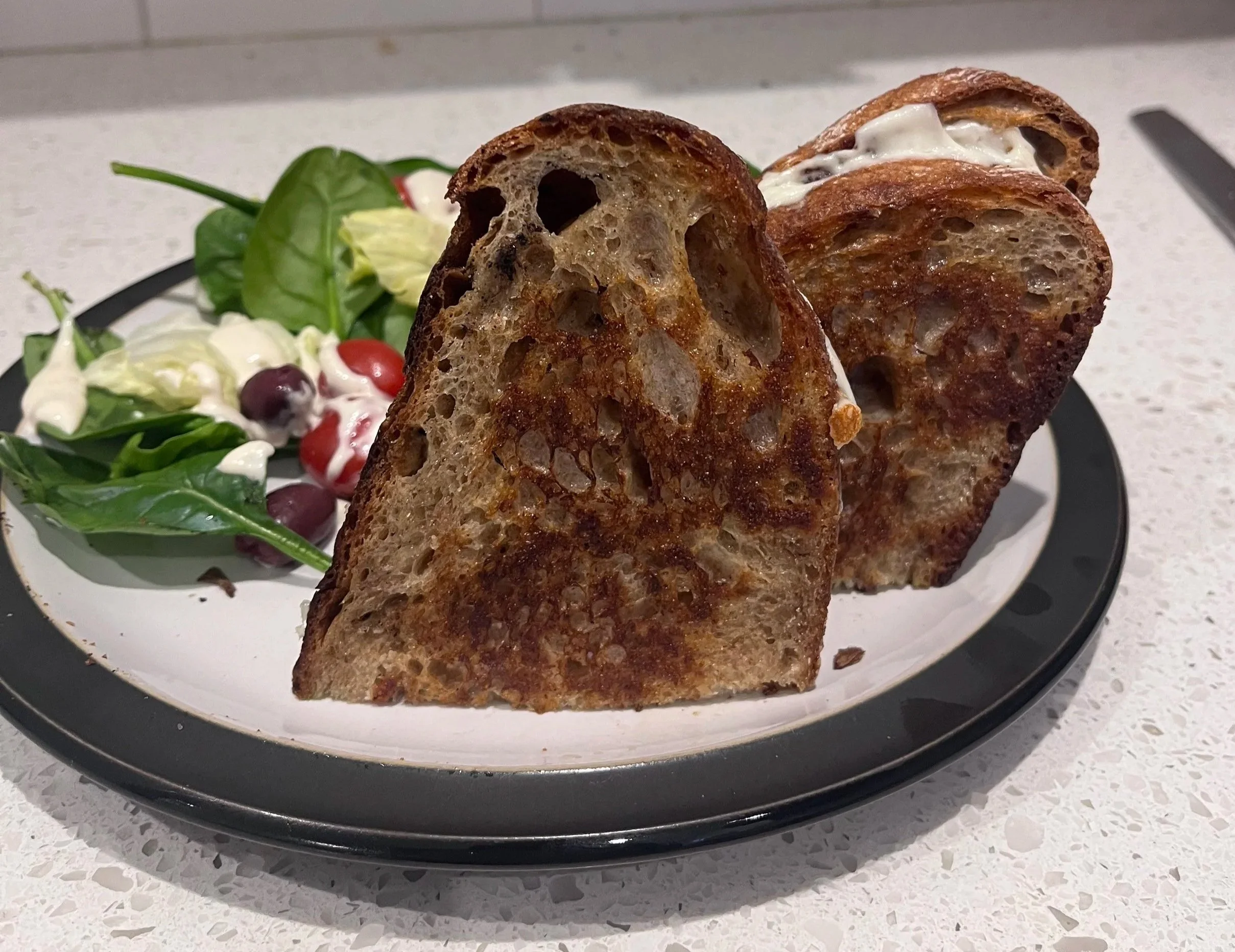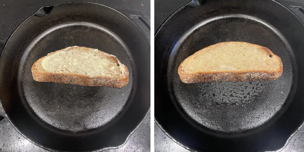Until now you can use the melting butter as your indicator of doneness.This stage is the one part where you have to keep an eye on it. I have been distracted by making a salad or warming my soup and overcooked it. The other nice thing about sourdough is it takes a while to burn, so you have a bit of leeway. Thank you, acidic bread with a low sugar content.